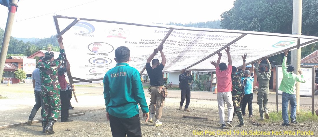 Pemerintah Kec.Wita Ponda bersama Babinsa dan petugas yang ada di Pos Covid 19 Desa Salonsa Kec.Wita Ponda memasang Baliho tentang Penerapan New Normal yang akan menjadi panduan dalam menerapkan disiplin Protokoler Covid 19 dimana jelas diatur dalam Perbub Morowali No.25 yaitu; keharusan menggunaan masker,disiplin jaga jarak dan cuci tangan di air yang mengalir. Hal ini tentunya harus dilaksanakan setiap warga masyarakat, Instansi/Kantor pemerintah maupun swasta serta pengelola tempat publik.