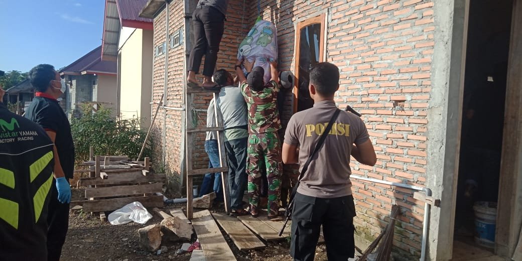Babinsa Koptu Faisal bersama beberapa warga dan petugas kepolisian dari Polsek Bungku Tengah ikut mengevakuasi warga yang tewas gantung diri di teras samping rumah di Desa Bahomohoni Kecamatan Bungku Tengah.